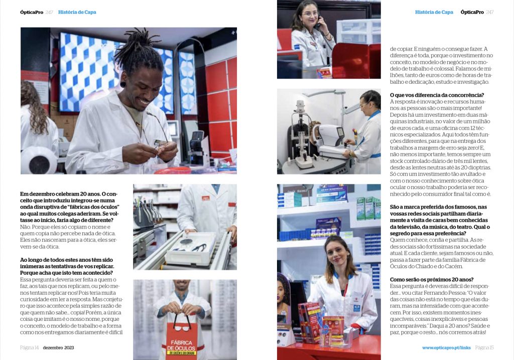 Neste mês de dezembro, a Fábrica de Óculos ganhou destaque na edição da revista ÓpticaPro. Numa reportagem, a nossa ótica foi abordada nas mais diferentes perspetivas. Por um lado, contou-se a história da Fábrica de Óculos, que está em Portugal há mais de 20 anos e marca o mundo da ótica, contando com alguns aliados importantes: desde o profissionalismo e a formação dos colaboradores à qualidade do produto.